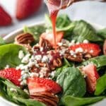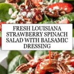 A refreshing Louisiana Strawberry Spinach Salad featuring a homemade strawberry balsamic dressing, candied pecans, fresh baby spinach, juicy strawberries, and crumbled blue cheese. This salad combines sweet, tangy, and savory flavors for a perfect light meal or side dish.