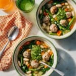 Keywords: meatball minestrone, Italian soup, beef meatballs, vegetable soup, cannellini beans, pesto soup, hearty minestrone
