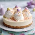 Keywords: meringue nest cheesecake, mini eggs cheesecake, no-bake cheesecake, Easter dessert, lemon cheesecake, chocolate digestive base