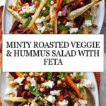 A vibrant and flavorful Minty Roast Vegetable & Hummus Salad featuring roasted parsnips, carrots, cumin-spiced chickpeas, and sweet beetroot, served over smooth hummus and topped with fresh mint and crumbled Greek-style cheese. Perfect as a wholesome vegetarian main or side dish.