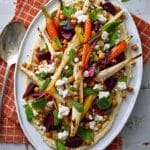 Keywords: roast vegetable salad, hummus salad, roasted parsnips, cumin chickpeas, beetroot salad, vegetarian salad, mint salad, Greek feta salad