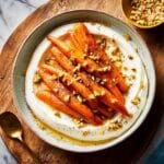 - Assemble and Serve: Spread the whipped ricotta dip evenly across a serving platter. Spoon the warm miso-glazed carrots over the top, drizzling any remaining roasting juices over them. Finally, sprinkle the chopped pistachios over the dish and serve immediately.