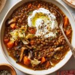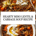 A hearty and flavorful Miso Lentil & Cabbage Soup combining earthy green lentils, savory pancetta, and umami-rich miso paste. This comforting soup is enriched with mushrooms, fresh vegetables, and finished with a dollop of thick yogurt, perfect for a nutritious and warming meal.