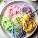 - Combine Noodles and Sauce: Add the colored noodles to the creamy sauce. Gently fold the noodles into the sauce to coat each strand while keeping the colors visually distinct for a cloud effect or swirl slightly for a marbled appearance.