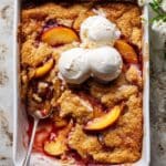Keywords: Peach cobbler, brown sugar cobbler, easy peach dessert, summer dessert, baked cobbler, maple syrup topping