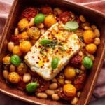 This one-pan baked feta dish features juicy summer cherry tomatoes, creamy butter beans, and tangy feta cheese all roasted together with aromatic oregano, paprika, and garlic. Finished with fresh lemon zest and juice, this vibrant Mediterranean-inspired meal is perfect for a quick, flavorful dinner served with toasted sourdough for scooping.