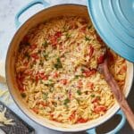 - You can add a splash of water if the dish begins to dry out before the orzo is fully cooked.