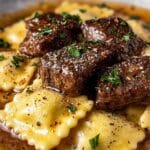 This One-Skillet Garlic Butter Steak & Cheese Ravioli is a delicious and easy-to-make meal featuring tender steak slices, cheese-filled ravioli, and a rich garlic butter sauce all cooked together in a single skillet for quick cleanup and maximum flavor.