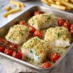 - Add vegetables and finish baking: Arrange the cherry tomatoes around the fish fillets on the roasting tin. After the chips have been in the oven for 30 minutes, place the roasting tin with the fish and cherry tomatoes into the oven alongside the chips. Bake everything together for the final 10 minutes, allowing the fish to cook through and the tomatoes to soften.