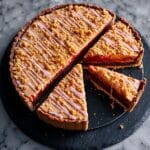 This PBJ Bakewell tart is a delightful twist on the classic Bakewell tart, combining a rich cocoa pastry with a peanut butter and roasted peanut filling layered over a sweet raspberry jam base. The result is a moist, nutty, and fruity dessert perfect for any occasion.