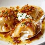 Pierogi Ruskie are traditional Polish dumplings filled with a creamy mixture of potatoes and cheese. These comforting bites are topped with buttery onions and served with sour cream, making them a beloved dish perfect for family meals or special occasions.