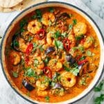 - Finish and Serve: Remove the pan from the heat. Stir in the dairy-free coconut yogurt, lime juice, and chopped coriander to add creaminess and freshness. Serve the prawn and aubergine curry hot with warmed rotis or flatbreads on the side.