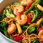 - Toss ingredients together: Add the cooked noodles, broccoli, and baby corn back into the pan with the sautéed red pepper. Add the raw prawns, tossing everything together to combine evenly.