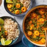 A vibrant and creamy prawn, pea, and spinach coconut curry served over fluffy microwave-cooked quinoa and basmati rice. This quick and nutritious meal combines aromatic spices, tender prawns, and fresh vegetables for a wholesome dinner bursting with flavor.