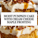 A moist and flavorful pumpkin cake topped with a rich, creamy cream cheese frosting, enhanced with a drizzle of maple syrup and a sprinkle of crunchy pecans. Perfect for autumn gatherings or any time you crave a comforting spiced dessert.