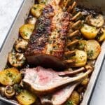 - Roast the lamb and potatoes: Place the seared rack of lamb on top of the potato mixture in the roasting tin. Transfer the tin to the preheated oven and roast for 25 to 30 minutes, or until the potatoes are tender and the lamb has reached your preferred doneness (pink is recommended for lamb).