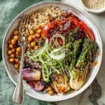 This roasted teriyaki veg bowl is a vibrant, healthy meal packed with colorful vegetables and hearty chickpeas. Tossed in a fragrant ginger-infused teriyaki sauce and served on a bed of brown rice, it’s perfect for a quick weeknight dinner or meal prep.