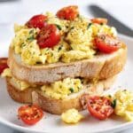 This scrambled omelette toast topper is a quick and delicious way to elevate your breakfast or brunch. Combining creamy eggs with sharp cheddar, fresh chives, and juicy cherry tomatoes, it’s a flavorful and satisfying dish that’s easy to prepare.