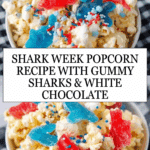 Keywords: Shark Week popcorn, gummy candy popcorn, white chocolate popcorn, holiday snack, party treat, sweet popcorn