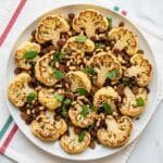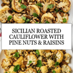 Keywords: Sicilian roasted cauliflower, roasted cauliflower with raisins and capers, pine nuts cauliflower recipe, healthy roasted vegetable side dish