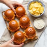 Keywords: Buffalo chicken sliders, chicken dip sliders, party appetizers, buffalo chicken recipe, Hawaiian roll sliders