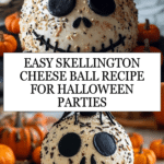The Skellington Cheese Ball is a fun and festive appetizer perfect for gatherings. Creamy and cheesy with a hint of spice, it’s shaped into a spooky skull and decorated with black olives to delight your guests.