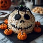 The Skellington Cheese Ball is a fun and festive appetizer perfect for gatherings. Creamy and cheesy with a hint of spice, it’s shaped into a spooky skull and decorated with black olives to delight your guests.