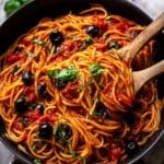 Store leftover pasta alla puttanesca in an airtight container in the refrigerator for up to 2 days. Reheat gently in a pan over low heat, adding a splash of water to loosen the sauce if it’s too thick. It’s best enjoyed fresh but still tasty when reheated carefully.