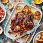 This Spiced Yogurt Barbecue Chicken is a flavorful and tender grilled chicken recipe featuring a rich marinade of natural yogurt, aromatic spices, garlic, lemon, honey, and vinegar. The chicken is butterflied, marinated for up to 24 hours, and cooked over indirect heat on a barbecue grill to achieve juicy meat with a perfectly charred exterior. Served with fresh lemon wedges, this dish is perfect for outdoor gatherings and summer meals.