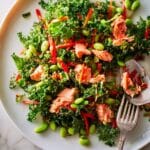 This Spicy Miso Salmon & Kale Salad is a vibrant and nutritious dish featuring tender salmon fillets coated in a spicy miso glaze, perfectly roasted to tender perfection. Tossed with a kale salad dressed in a creamy, flavorful dressing made from apple cider vinegar, soy sauce, garlic, nutritional yeast, sesame oil, sriracha, and rapeseed oil, this salad combines earthy, spicy, and tangy flavors with crunchy vegetables like red pepper, carrot, and edamame, making it a satisfying and healthy meal for any time of the day.