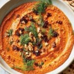 This spicy red pepper dip paired with crispy harissa vegan mince is a flavorful and vibrant dish perfect for sharing. The smoky, nutty muhammara sauce complements the bold, spicy mince, making it a satisfying option for a casual meal or appetizer.