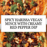 Keywords: spicy red pepper dip, harissa mince, vegan mince, muhammara, Middle Eastern dip, vegan recipe, flatbread dip, walnut dip, plant-based, harissa paste