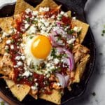 Chilaquiles is a traditional Mexican dish featuring crispy corn tortilla chips baked and topped with a flavorful tomato and serrano chili sauce, finished with fried eggs, Mexican crema, and queso fresco. This comforting breakfast or brunch option combines crunchy textures with spicy, tangy, and creamy elements for a delicious and satisfying meal.