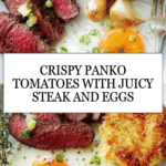 Keywords: steak and eggs, panko crusted tomatoes, sirloin steak recipe, breakfast steak, fried eggs, pan-seared steak, brunch recipe