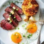Keywords: steak and eggs, panko crusted tomatoes, sirloin steak recipe, breakfast steak, fried eggs, pan-seared steak, brunch recipe