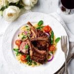Keywords: lamb cutlets, fig jam glaze, couscous salad, green beans, balsamic vinegar, mint, easy dinner recipe, Mediterranean lamb