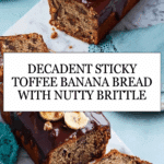 Keywords: Sticky toffee banana bread, banana bread recipe, toffee sauce, banana nut brittle, dessert bread, moist banana bread