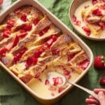Strawberries & cream bread and butter pudding is a delightful twist on a classic dessert. With layers of jam-spread bread soaked in creamy custard and topped with fresh strawberries, it’s a perfect treat for any occasion.