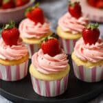 Store the cupcakes in an airtight container at room temperature for up to 2 days. If you need to keep them longer, refrigerate for up to 4 days but bring to room temperature before serving. The cupcakes are best enjoyed fresh as the fresh strawberries inside can make them slightly moist over time. Avoid freezing if possible, as the texture may change.