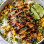 This Street Corn Chicken Rice Bowl combines tender, spiced chicken thighs with a vibrant cilantro-lime jasmine rice and a creamy, charred street corn salad featuring Cotija cheese. This flavorful bowl is perfect for a balanced, satisfying meal with Mexican-inspired flavors, offering a delightful mix of textures from juicy chicken to charred corn and zesty rice.