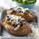 - Assemble and Serve: Remove the potatoes from the oven, split each open down the middle, and spoon the sautéed mushrooms over the top. Sprinkle freshly grated Parmesan over the mushrooms and serve immediately.