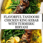 A flavorful and aromatic Tandoori Chicken King Kebab served with a vibrant turmeric and green bean biryani. This dish combines tender marinated chicken thighs grilled to perfection with a fragrant basmati rice biryani infused with spices and fresh green beans, creating a delightful Indian-inspired meal perfect for sharing.