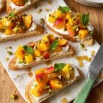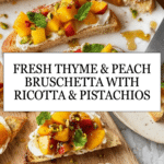 This thyme and peach bruschetta with ricotta and pistachios is a delightful blend of sweet, savory, and fresh flavors. Perfect as a light snack or appetizer, it highlights juicy roasted peaches paired with creamy ricotta and crunchy pistachios for a truly elegant treat.