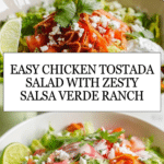 This vibrant and flavorful Tostada Salad combines crispy tostada shells layered with savory shredded chicken, cilantro lime rice, black beans, and melted cheddar cheese. Topped with fresh romaine, pico de gallo, crumbled cojita cheese, crunchy tortilla strips, and a dollop of sour cream, it’s finished with a zesty homemade salsa verde ranch that ties all the elements together for a perfect Tex-Mex inspired meal.