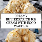 Keywords: butterscotch ice cream, no churn ice cream, homemade ice cream, sea salt candies, butterscotch syrup dessert, ice cream with waffles