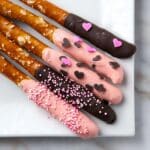 Celebrate Valentine’s Day with these festive and colorful pretzel rods dipped in pink and black candy melts, then decorated with heart and confetti sprinkles for a sweet and crunchy treat perfect for gifting or sharing.