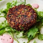 - Serve: On individual plates, pile a generous handful of fresh rocket (arugula). Place one beetroot and quinoa burger on top of each bed of rocket. Drizzle the beetroot yogurt dressing over the burger and salad, then sprinkle with fresh coriander leaves for garnish. Serve immediately.