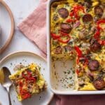 Yes, you can swap veggie sausages for your preferred variety, including meat-based sausages if you’re not vegetarian. Just ensure they are cooked before assembling the casserole.