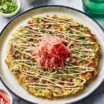 This Veggie Okonomiyaki is a delicious Japanese-inspired savory pancake packed with fresh vegetables like pak choi, Savoy cabbage, and spring onions. Bound together with eggs, flour, and milk, and flavored with low-salt soy sauce and a touch of chili, this dish is cooked on the stovetop until perfectly golden and tender. Finished with a tangy lime mayonnaise drizzle and optional sushi ginger and wasabi, it’s a vibrant, healthy, and satisfying meal perfect for any day.