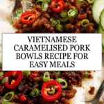 Vietnamese Caramelised Pork Bowls are a deliciously sweet and savory dish that brings bold flavors to your dinner table. The caramelised pork pairs perfectly with fragrant jasmine rice and fresh vegetables for a satisfying meal.